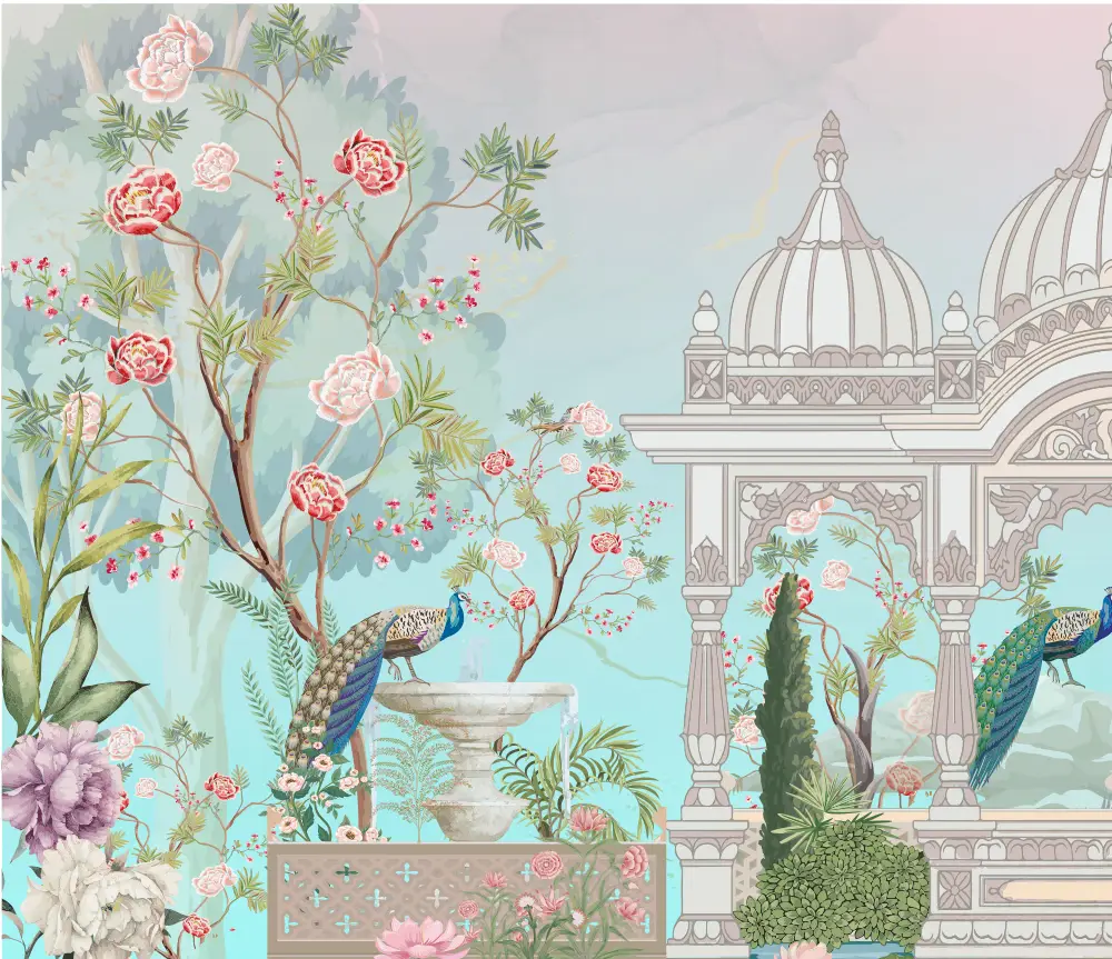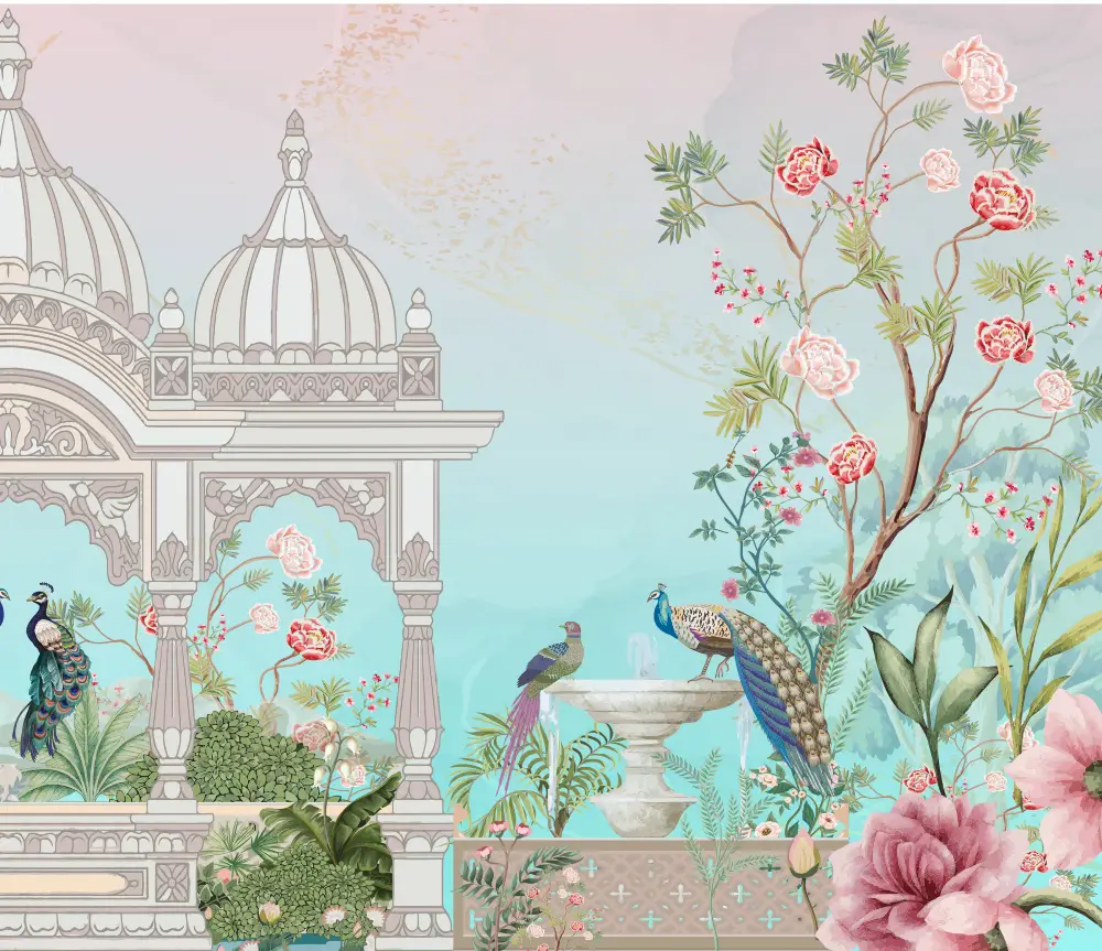 Create a refined and luxurious atmosphere with this exquisite Romantic Garden Scenery Photo Zone showcasing a grand pavilion design with intricate arches, domed rooftops, and twin peacocks surrounded by lush floral greenery. The pastel sky tones and detailed artwork make it a standout choice for elegant indoor events, photo booths, wedding corners, or branded studio shoots. Its dreamy aesthetic suits any event looking for upscale, soft-toned decor.
