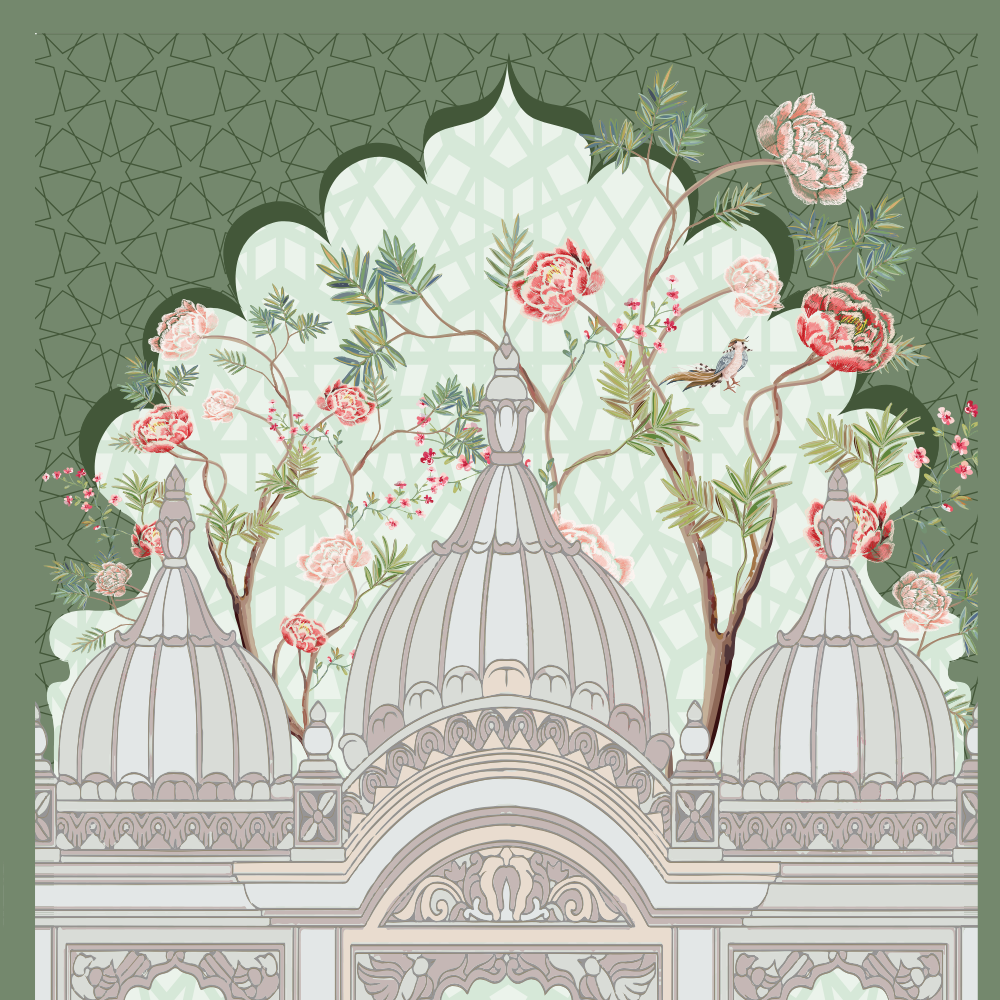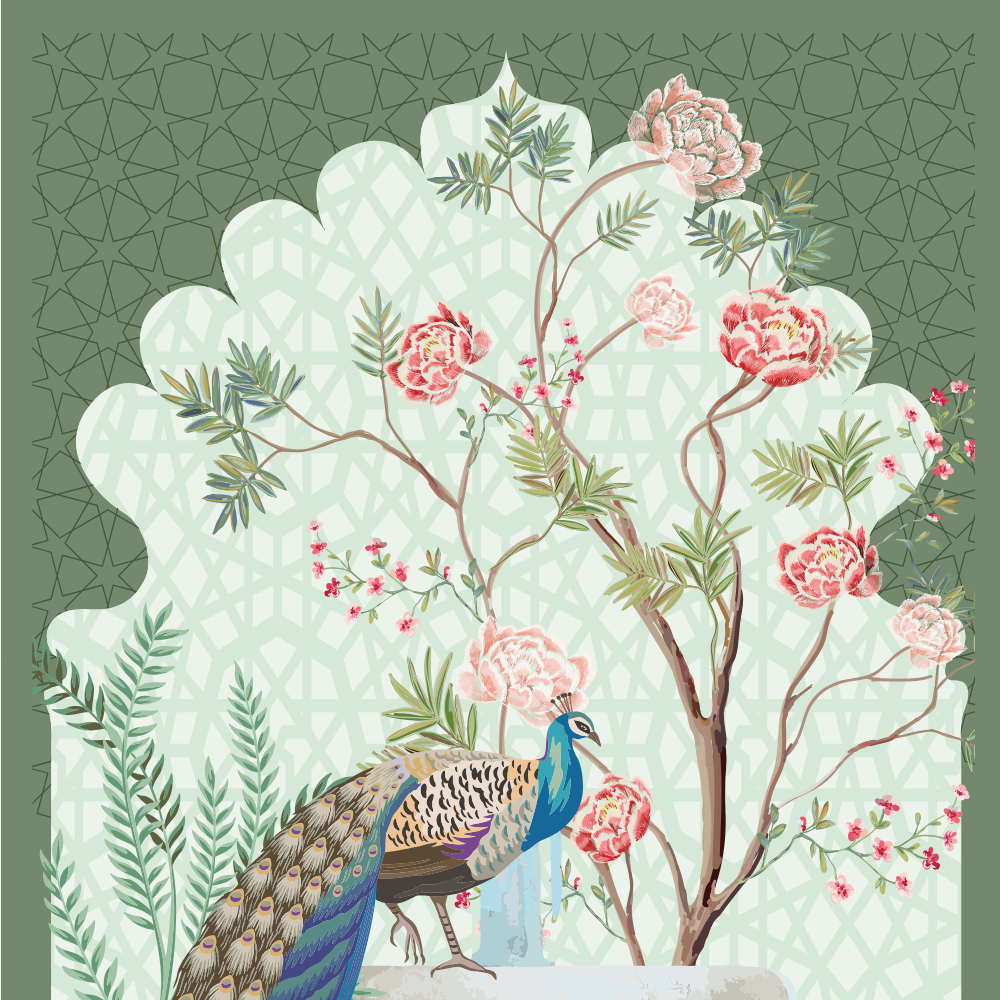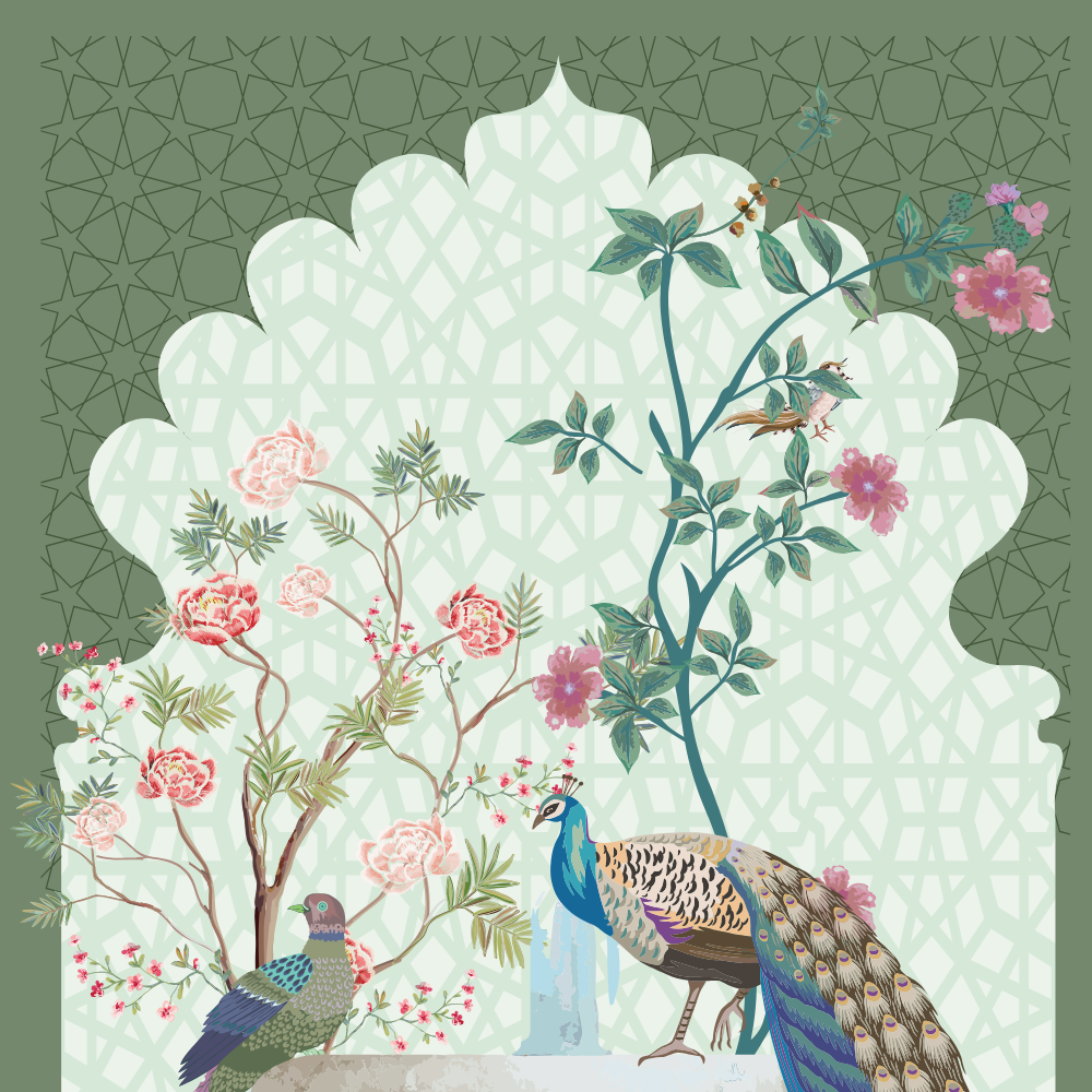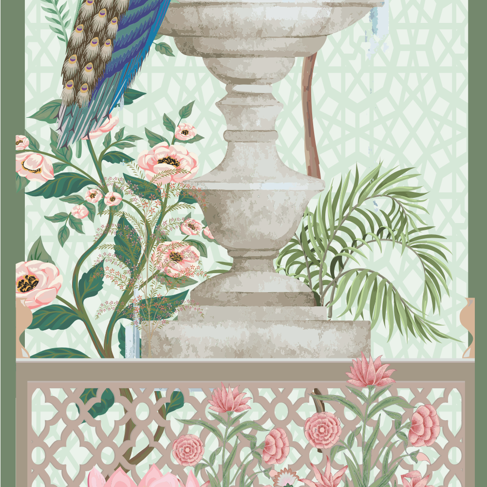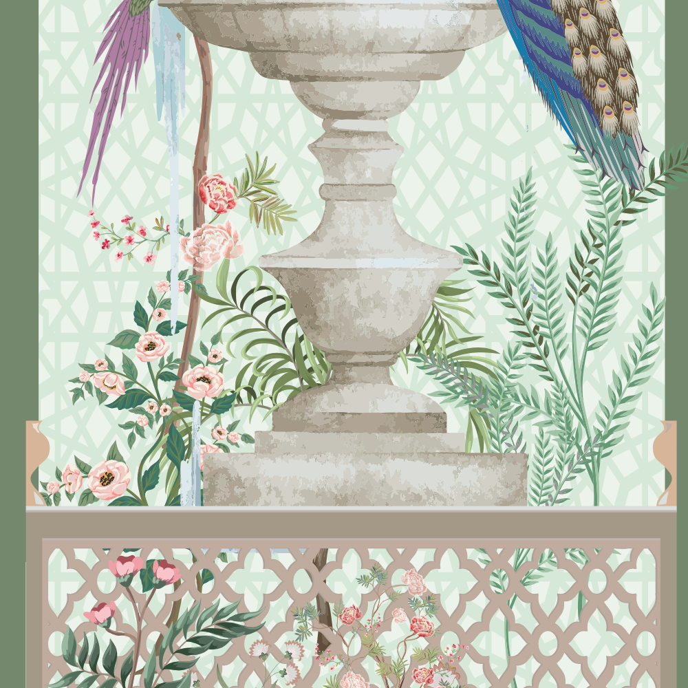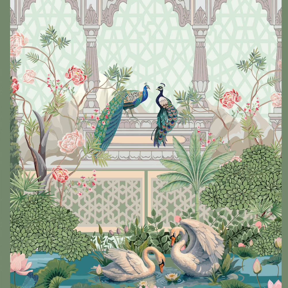 This soft pastel Swan Palace Mural is a versatile favorite for decorators looking for a dreamy, floral, and garden-inspired look. Featuring swans gliding in a pond, peacocks perched on fountains, domed palace structures, and blossoming trees, this design suits a wide variety of needs — from indoor party decoration and photo shoot backdrops, to studio staging, gallery installations, or fashion photography sets.